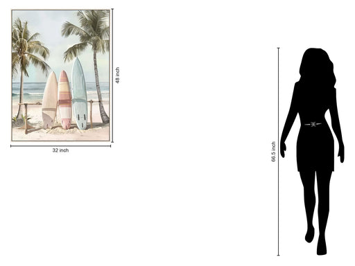 “Surfside” captures the serene beauty of a coastal morning with three surfboards resting against a makeshift rack between palm trees. This hand-pai...