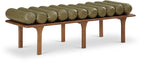 Outfit your foyer, bedroom, dressing room or other area of the home with this handsome Landon vegan leather bench. A rolled vegan leather seat upholstered in vegan leather gives this uniquely designed bench the luxe look of leather without the maintenance requirements. Built to last, this art-deco-inspired bench has a solid oak base finished in sleek walnut for a beautiful, resort feel in whatever room you wish to use it in.