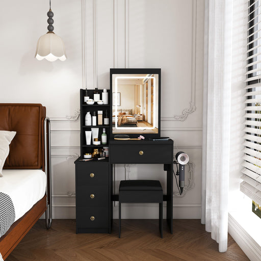 View full detailsVanity Table With Mirror, Adjustable LED Lights, Power Outlet, Hairdryer Holder & Stool