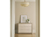 The Oasis Dresser features elegant three-drawer storage with sculptural wave-patterned drawer fronts in white, beautifully contrasting with the warm Dockside oak case. This dresser provides ample storage while soft-close drawer guides ensure quiet, smooth operation.