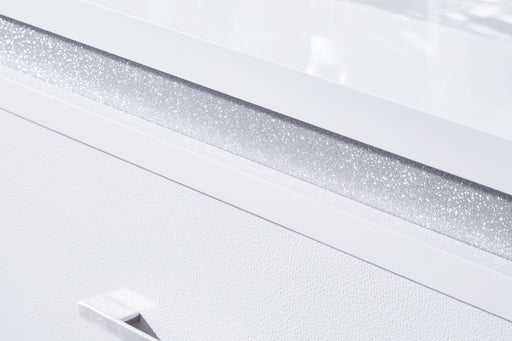 This dresser with mirror is a showstopper, bringing a touch of modern glamour to your sanctuary. A sleek white finish and inset glitter accents cre...