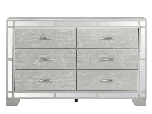 Embossed "X" Design: Silver Champagne embossed "X" design on wood veneers gives a luxurious touch to this bedroom group. Chrome Drawer Pulls: Up...
