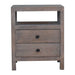 - Artisan Furniture Solid Wood Acid Wash 2 Drawer Open Bedside - This sleek and versatile bedside table offers a perfect blend of functionality and modern design. Made from solid wood, it features a beautiful weathered finish that enhances its natural grain, adding a touch of rustic elegance. The table includes two spacious drawers with smooth black metal knobs for storing essentials, as well as an open shelf that is ideal for displaying books, decor, or a bedside lamp. Its sturdy construction and clean, minimalist lines make it a timeless addition to any bedroom or living space.