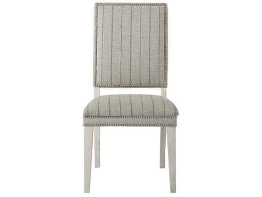 The Hamptons Dining Chair features a tall, slender silhouette upholstered in a finely striped fabric, strong tapered legs and a delicate nail head ...