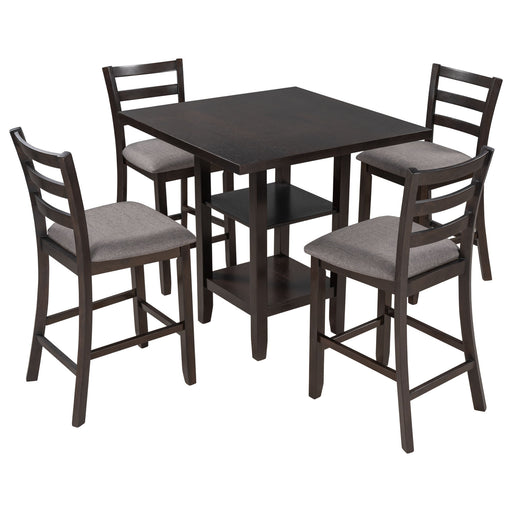 View full details5 Piece Wooden Counter Height Dining Set With Padded Chairs, Storage Shelving
