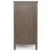 - Transitional design includes shaker style doors featuring X detail in panel, bronze pulls and square tapered legs