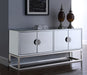 Keep everything you need to serve delicious meals at hand in the Marbella Sideboard Buffet from Meridian Furniture. This handsome yet modish buffet offers a sleek contemporary look for your modern dining room with low-profile hardware and a boxy shape. The stainless steel base adds to its durability, while the mirrored design ensures that it keeps pace with up-to-the-minute decor. Store cookware, serving ware and more inside two double door sections to keep your space tidy and neat.