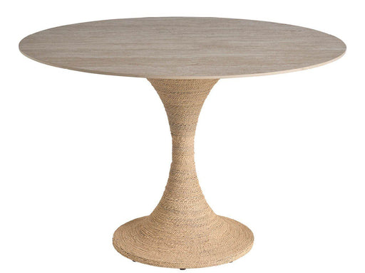 The Oasis Dining Table features a 44-inch round stone top in Travertine Beige beautifully supported by an hourglass-shaped base wrapped in natural ...