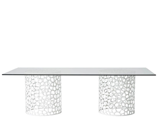 The Coral Dining Table features a rectangular glass top supported by two coral-inspired cast aluminum bases in a clean white finish. This dining ta...