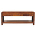 • Aspen Media Unit - Discover the Aspen Media Unit: a piece expertly crafted from 100% solid mango wood in a lush chestnut finish. Designed with smooth corners for added safety and a contemporary flair, it seamlessly fits into a variety of interior decor styles. Offering ample storage and a sleek aesthetic, the Aspen Media Unit is the perfect addition to any living area, ideal for organizing media components and displaying your favorite decorative pieces. A durable investment that enhances the functionality and style of your home.