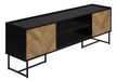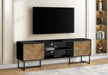 • Durable Design: This 72-inch TV stand features a contemporary brown and black laminate finish paired with a sturdy black metal frame, enhanced by V groove lines on the wood-look doors for a modern aesthetic appeal.