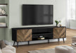 • Stylish Storage: The media entertainment center is adorned with brown wood-look doors featuring slanted groove lines, enhancing its stylish appeal, and includes two wire management holes for organized storage.