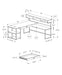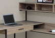 • Worksurface Layout: The desktop is divided into two segments, with a large panel overlapping the storage unit with a hutch, creating a smaller, lower workspace and additional storage cubby for flexibility.
