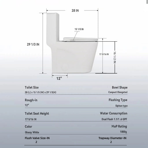 View full detailsGlossy Tornado Flush 1 Piece Toilet With Dual Flush, Soft Close Seat - Gloss White