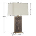 The Lafferty Table Lamp Showcases A Emperador Dark Brown Marble Slab Encased In A Plated Brass Frame, Accented With Matching Details. The Slightly Tapered Rectangular Hardback Shade Is An Off-white Linen Fabric With Soft Curved Corners.