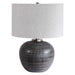 Finished In A Charcoal Glaze With Etched Texture, This Table Lamp Adds A Casual Yet Contemporary Feel To A Space. The Round Ceramic Base Is Complemented By Brushed Nickel Hardware. A Round Hardback Drum Shade In Oatmeal Linen Completes The Piece.