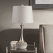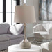 This Sleek Spun Metal Base Features A Plated Brushed Nickel Finish, Displayed On A Smoothed Natural Concrete Foot. The Tapered Round Hardback Shade Is A Light Gray, Coarse Weave Linen Fabric.