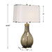 The Shyla Table Lamp Showcases A Dark Moss, Heavily Seeded Teardrop Glass Base Complemented By Plated Brushed Brass Accents. The Slightly Tapered Oval Hardback Shade Is Covered In A Timeless White Linen Fabric.