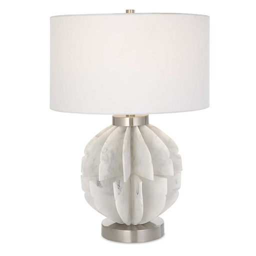 This Contemporary Table Lamp Features Thin Stacked Blades That Create An Organic Sphere Finished In A White Marble Look Accented By Plated Brushed ...