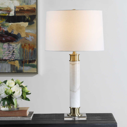Crafted From White Marble With Subtle Veining, This Table Lamp Is Displayed On A Thick Crystal Foot, Complemented By Plated Antique Brass Accents. ...