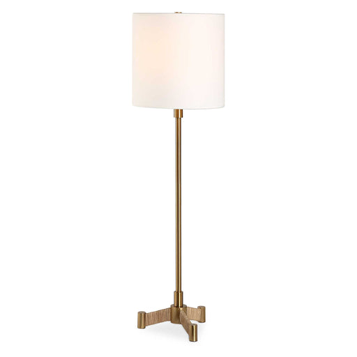 This Versatile Buffet Lamp Showcases A Plated Brass Slim Metal Base Accented By Rattan Wrapped Legs. The Petite Round Hardback Drum Shade Is A Cris...