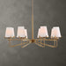 Modern Beauty With Graceful Accent Lines In A Warm Brass Finish. Arms Are Topped With Matte Opal Glass Cone Shaped Shades Giving Us A Spectacular Transitional Chandelier. 8-60 Watt Max Candelabra Sockets. Bulbs Not Included. Supplied With 20' Wire, 3-12" Stems And 1-6" Stem For Adjustable Installation.