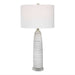 This Sleek Ceramic Table Lamp Features A Matte White Glaze With Brushed Light Gray Detailing, Paired With Brushed Nickel Plated Accents And A Crystal Foot. A White Fabric Drum Shade Compliments The Piece.