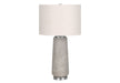 - Modern Design: Features a subtly textured grey resin cylinder base with polished silver metal footing and an ivory linen drum shade topped with a silver finial.