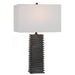 This Ceramic Table Lamp Features A Deep Ribbed Texture With A Subtle Organic Shape Finished In A Metallic Charcoal Glaze, Accented With Matching Metal Details. The Rectangle Hardback Shade Is A White Linen Fabric.