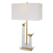 The Songbirds Table Lamp Displays Two Cast Brass Birds Counterpoised On A White Marble Sling Atop A Brushed Brass Plated Iron Base. Complemented By A Rectangular Hardback Shade In A White Linen Fabric.