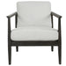 This Refreshing Take On A Modern Accent Chair Features A Curved Open Back Design In Solid Oak Wood. The Dark Espresso Stain Has A Light Gray Glaze Enhancing The Wood Grain. Loose Seat And Back Cushions Are Tailored In A Plush Polyester Channeled White Fabric.
