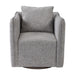 Casual Shelter Arm Accent Chair Tailored In A Woven Linen Blend Fabric In Natural Stone Hues Of Gray, Tan And Ivory. Features A Flanged Edge Trim Complete With A Loose Back Pillow. Rests On A Solid Birch Wood Swivel Base, Finished In A Weathered Gray Stain.