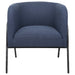Inspired By Scandinavian Designs, This Barrel Back Style Chair Showcases Elegant Curved Lines With A Chiseled Iron Frame In A Natural Aged Black Iron Finish. A Regatta Blue Polyester Fabric Accents This Modern Look.