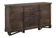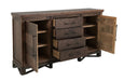 4 Drawer & 2 Door, Console. This console is crafted from exquisite parota wood, showcasing timeless beauty and unparalleled durability. Part of the elegant Walnut Collection, it features a rich reddish-brown tone enhanced by a translucent multi-step lacquer finish that highlights the wood's natural grain and character. The console features four drawers, two doors, and fixed shelves, offering ample storage space. The textured base adds a distinctive touch of sophistication, elevating the overall design. Transform your living space into a haven of style and craftsmanship with the Walnut Collection, a perfect blend of exceptional artistry and modern elegance.