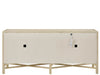 The Dockside Credenza features door panels showcasing a woven cane weave for rich texture and organic warmth. Its X-base stretcher and ample interior storage create a statement piece that perfectly balances natural elements with refined coastal style.