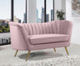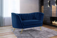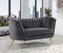 Lean back and lounge in luxurious style on this stunning Margo velvet loveseat by Meridian Furniture. This contemporary loveseat features plush velvet upholstery that is both classy and sumptuous against your skin, a single seat cushion and rounded arms that curve into a low, rounded back, creating a perfect, modern piece for your home. stainless steel legs support this loveseat and provide stunning contrast to the loveseat's plush, fabric.
