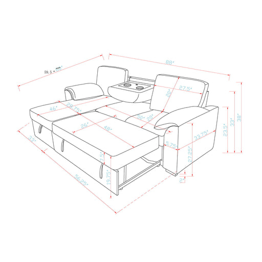 Sectional Sofa Bed With Pull Out Sleeper, USB Ports, Cup Holders