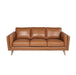 Bring comfort and style to your living room with this beautiful wood base sofa. Upholstered in exquisite top grain leather, this caramel-colored sofa imbues any space with contemporary elegance. Double track arms and welted box seats and back cushions offer striking style details. Tapered cylindrical wooden legs provide the perfect final touch.