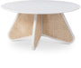 Bring impressive style and impeccable beauty to your living room or family room with this Butterfly coffee table. This handsome table is part work of art, part functional addition to your room. An expansive round oak veneer top gives you room for resting a drink or book or setting up your Scrabble board on family game night. Construction with rubberwood and wood products gives this Butterfly table a resilient design, while its natural cane bottom adds a striking visual and instantly draws the eye.