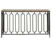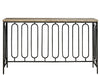 The Griffith Park Console is a stunning blend of natural and industrial elements. Its slender Gray Tavertine stone top, with its subtly chipped edges, contrasts elegantly with the intricate, oval-shaped, oil-rubbed bronze metal base. This captivating piece is a true work of art, sure to be a focal point in any room.