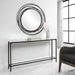 Classic And Minimalistic, This Narrow Console Table In Steel Is Finished With A Streamlined Rustic Black, Inset With A Beveled Mirrored Top, And Gallery Shelf In Clear Glass.