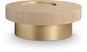 Go bold or go home when you add this handsomely crafted Makai oak and brushed brass coffee table to your modern room. A contemporary design with sunken geometric details on its top makes this round two-tiered table a must have for the modern home. Its rich color with brushed brass finished base instantly commands attention in your living room, family room, or den. Oak veneer construction ensures sturdy durability and long-lasting beauty of this handsome coffee table.