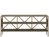 The Brindle Console Table makes a dramatic statement with an expansive Dark Gray Travertine top supported by an architectural Smoked Gold metal frame. Distinctive X-pattern bracing and two Cocoa wood shelves create a substantial presence perfect for entryways or behind seating areas.