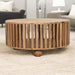 - Slatted Round Oak-ish Coffee Table - A captivating fusion of modern aesthetics and natural craftsmanship, this round coffee table is expertly handcrafted from 100% Solid Mango Wood in a warm Oak-ish finish. Its slatted base design creates a striking visual appeal while allowing for an airy, open feel. Resting on bun wooden feet, this table exudes effortless elegance and stability, making it an ideal centerpiece for living rooms. Perfect for styling with decor or everyday essentials, its sustainable craftsmanship and timeless design bring warmth and sophistication to any space.