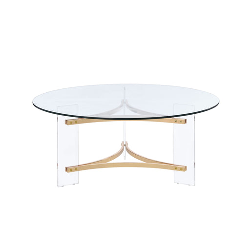 Contemporary Design: This coffee table features a high-gloss finish with stylish oval and round shapes, complemented by sleek metal legs that con...