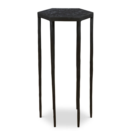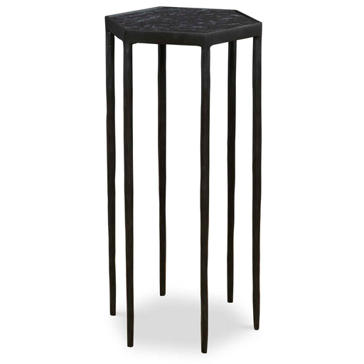 This Striking Hexagonal Table Features A Chiseled Iron Base Finished In Satin Black Paired With A Honed Black Marble Top With Natural White Veining...