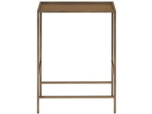 The Metal Side Table features sleek design with a distinctive tray top and a minimal geometric frame in Smoked Gold finish. This compact accent pie...