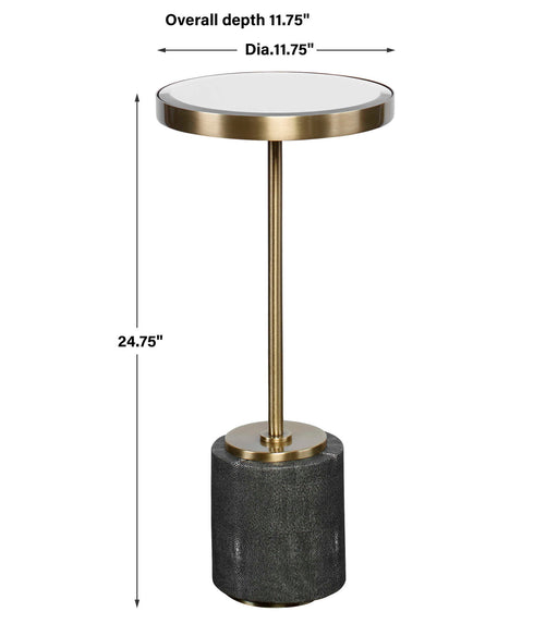 Stylish And Sophisticated, This Round Accent Table Features A Gray Faux Shagreen Base Paired With An Iron Support In Rich Brushed Brass And A Bevel...