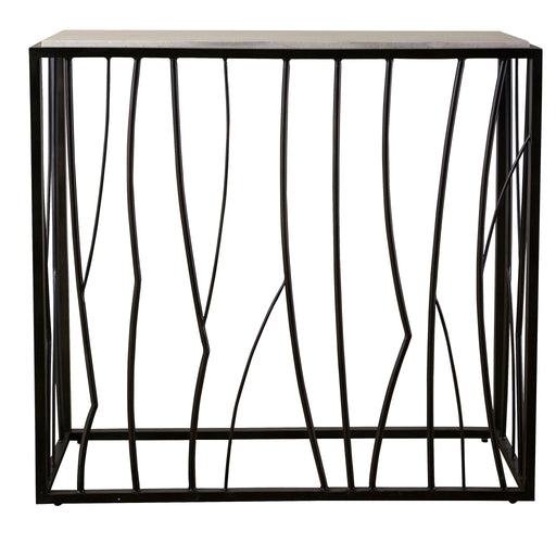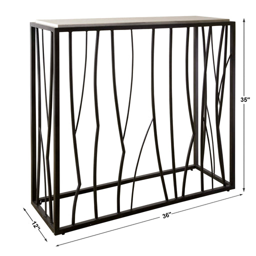 Inspired By Natural Landscapes, This Console Table Features An Asymmetrically Designed Metal Base Finished In Dark Iron Paired With A Natural Ivory...