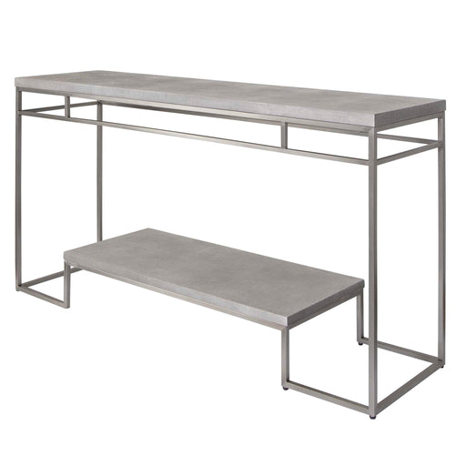 Exhibiting A Modern Minimalist Design, This Tray Style Console Table Features A Rich, Charcoal Gray Faux Shagreen Paired With A Plated Brushed Bras...